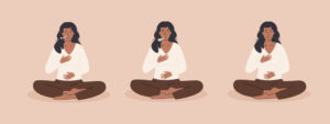 Energy practice. Black woman exhaling and inhaling. Young female doing abdominal exercise. Deep belly breathing. Meditation, diaphragm breathing, pranayama yoga. Vector flat illustration set.